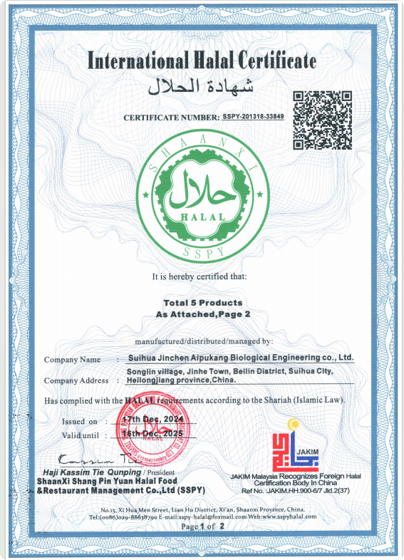 綏化金晨愛普康生物工程有限公司已成功通過出口企業(yè)的HALAL認(rèn)證