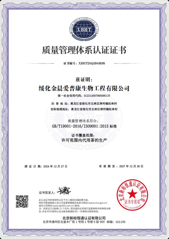綏化金晨愛普康生物工程有限公司已成功通過質(zhì)量管理體系認(rèn)證,環(huán)境管理體系認(rèn)證,職業(yè)健康管理體系認(rèn)證。